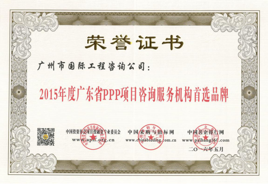 廣州市國際工程咨詢公司已連續(xù)兩年,蟬聯(lián)年度中國PPP項目咨詢服務機構十大頂級品牌等獎項。