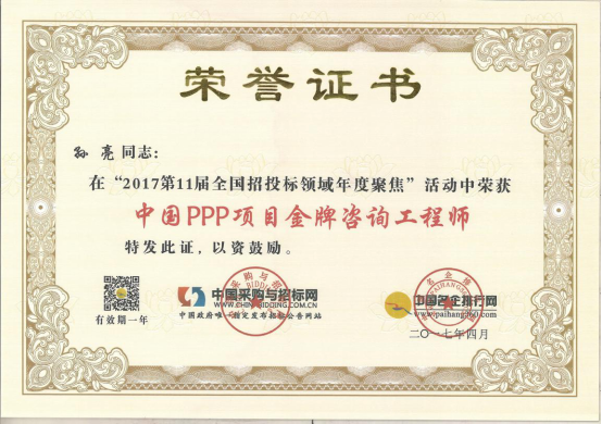 為在PPP咨詢行業(yè)內樹立標桿企業(yè),國家發(fā)改委中國投資協(xié)會項目投融資專業(yè)委員會、中國采購與招標網、中國名企排行網聯(lián)合主辦了“第10、11屆PPP咨詢服務機構評價推薦”活動。秉承“公開、公平、公正、誠實信用”的原則,最終遴選出年度中國PPP咨詢服務機構類大獎。在活動中,廣州市國際工程咨詢公司榮獲“2015、2016年度中國PPP項目咨詢服務機構百強(前十強)”,”2016年度中國PPP項目咨詢服務機構十大頂級品牌”、”2016年度中國PPP項目咨詢服務最佳智庫獎”、”2015年度廣東省PPP項目咨詢服務機構首選品牌”、”2015年度市政基礎設施PPP項目咨詢服務機構首選品牌”等集體榮譽類大獎。此外,公司PPP項目咨詢中心主任肖桃生、副主任盧世君、陳偉雄、孫亮分別榮獲2015、2016年度中國PPP項目金牌咨詢工程師稱號。