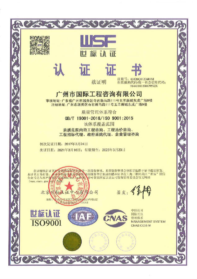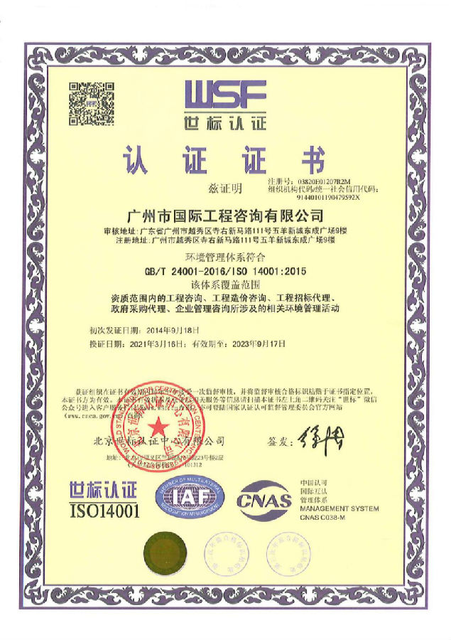 根據質量、環境、職業健康安全管理體系認證機構---北京世標認證中心有限公司的審核計劃書要求,北京世標認證中心有限公司于3月1日至3月2日對我司開展了質量、環境及職業健康安全管理體系換證后第一次監督審核認證工作,審核范圍包括工程咨詢服務、工程招標代理、政府采購代理、企業管理咨詢服務等內容。廣州市國際工程咨詢有限公司的監督審核認證工作于3月2日順利完成,并于3月下旬獲得了質量、環境及職業健康安全管理體系認證證書。